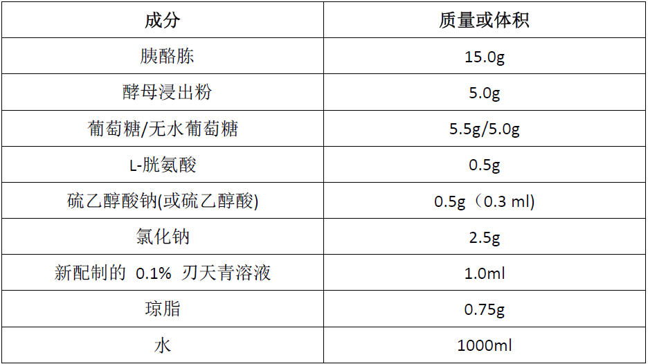 酪胨(胰酶水解))和L-胱氨酸:是由酪蛋白经过胰酶水解后,将大分子的酪蛋白分解为䏡、胨、肽及多种氨基酸。由于原材料是从奶中提取的酪蛋白,质量稳定,氨基酸种类多,优于一般的胨,与L-胱氨酸构成细菌成长所需的氮源。