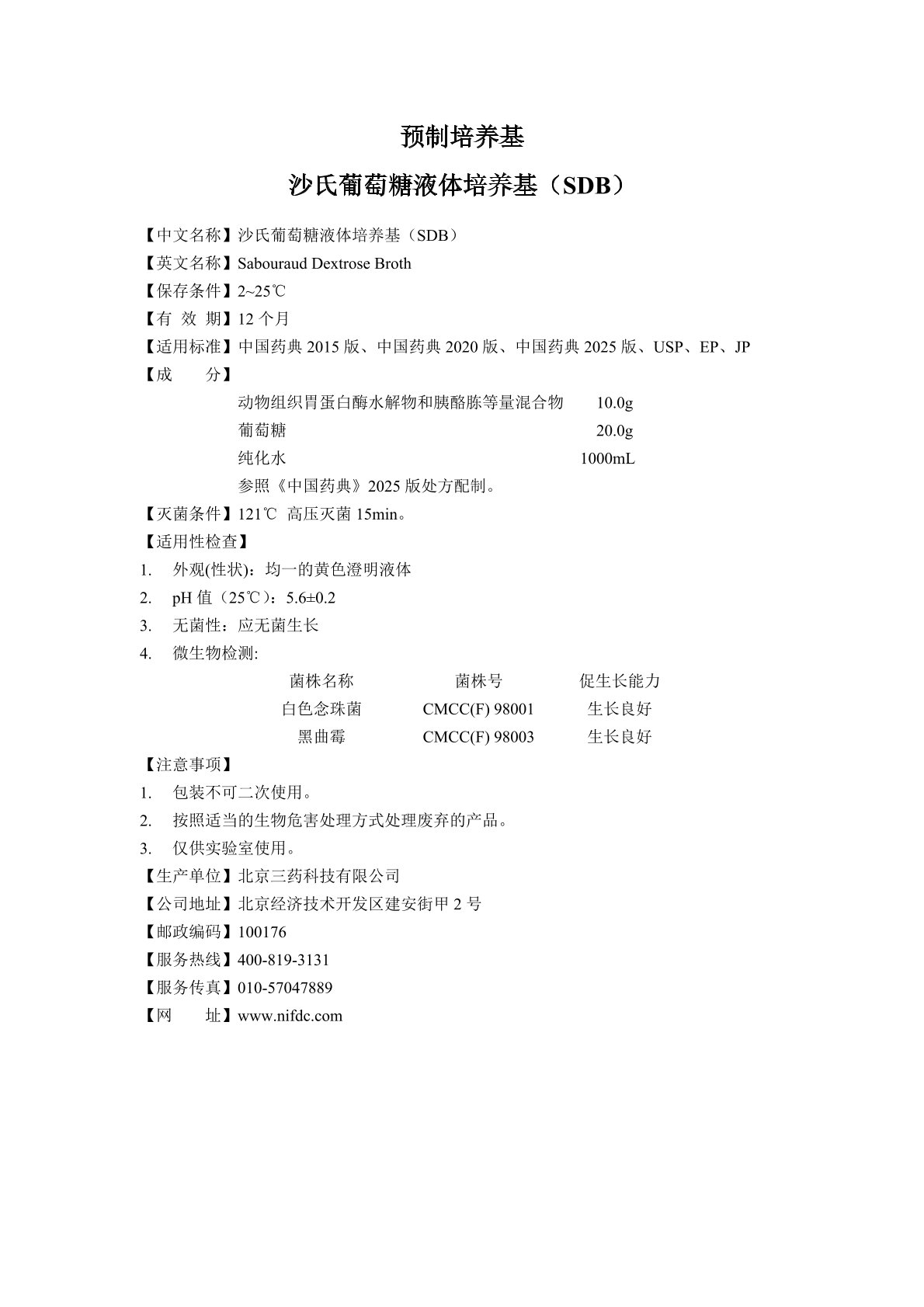 | 中文名称 | 沙氏葡萄糖液体培养基(SDB) |